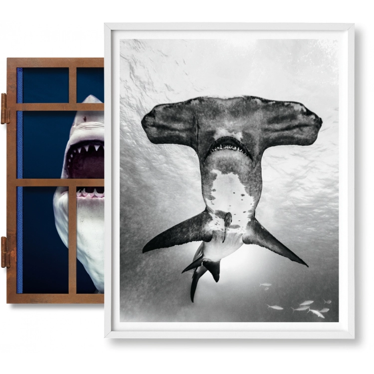 마이클 뮐러(Michael Muller)의 **"샤크스(Sharks)"** 아트 에디션은 바다의 멸종 위기에 처한 포식자에 대한 궁극적인 헌사로, 그의 놀라운 상어 포트폴리오를 금속 상어 우리 안에 담아 선보입니다. 이와 함께 **"언더 스터디(Under Study), 2015"**라는 서명된 프린트가 포함되어 있습니다. 이 놀라운 이미지는 가장 잘 나타나지 않는 상어인 대 해머헤드 상어를 섬세한 질감과 13피트의 장엄함으로 포착합니다.