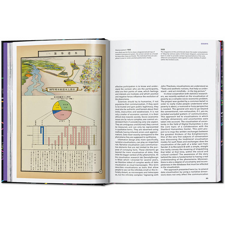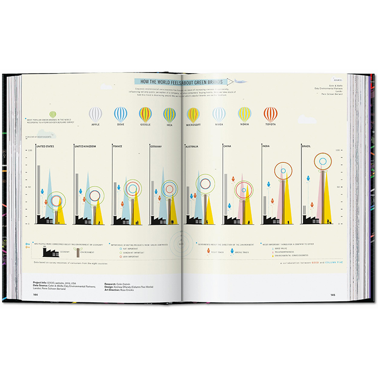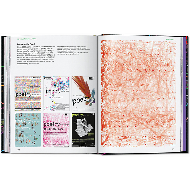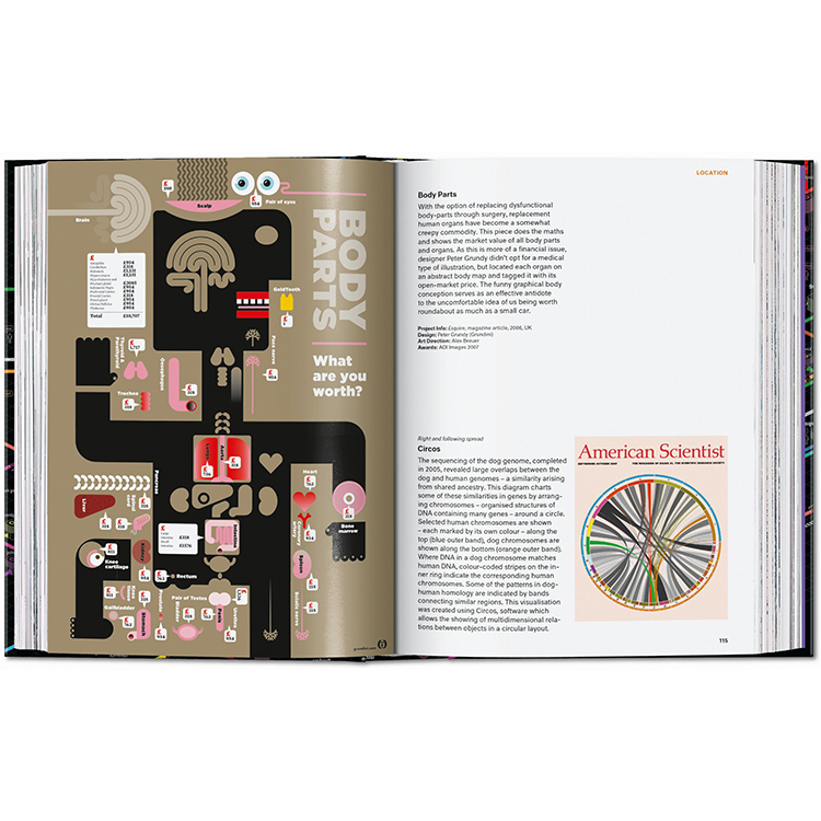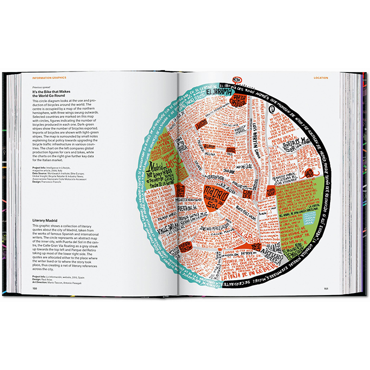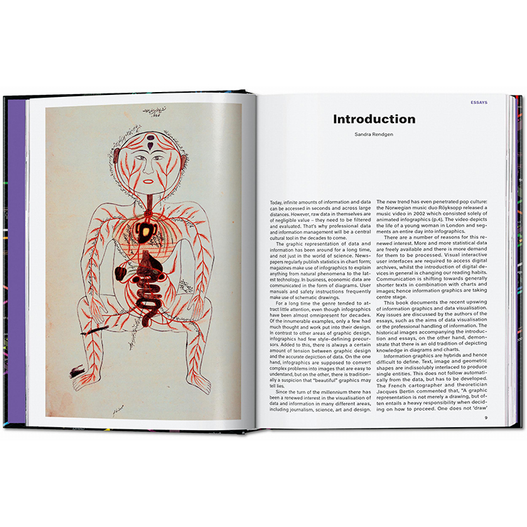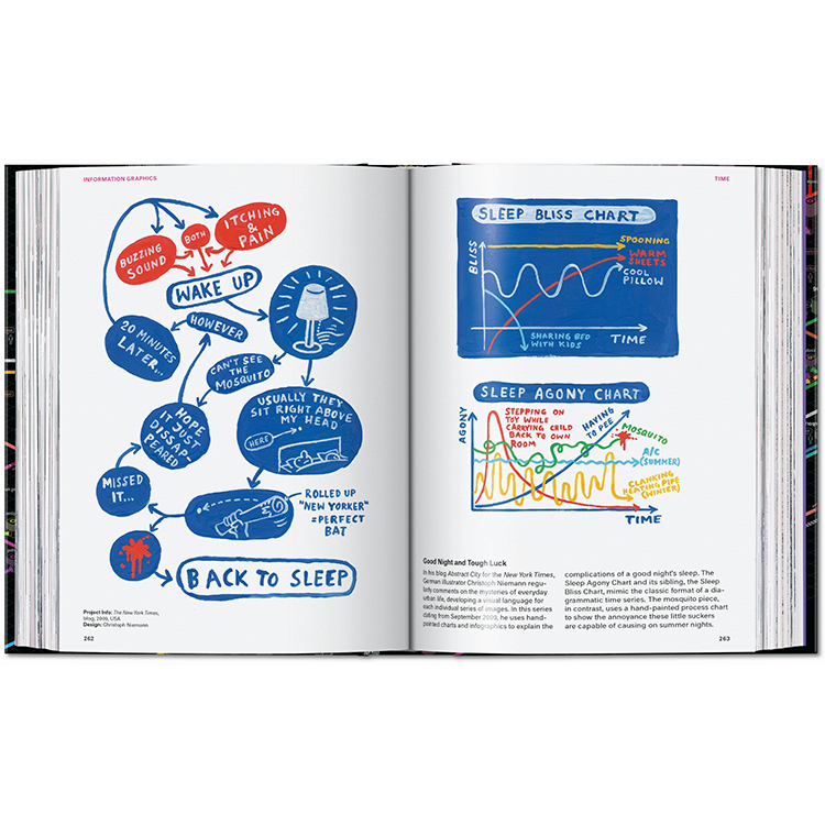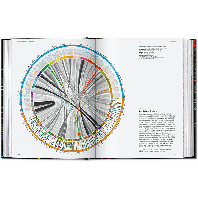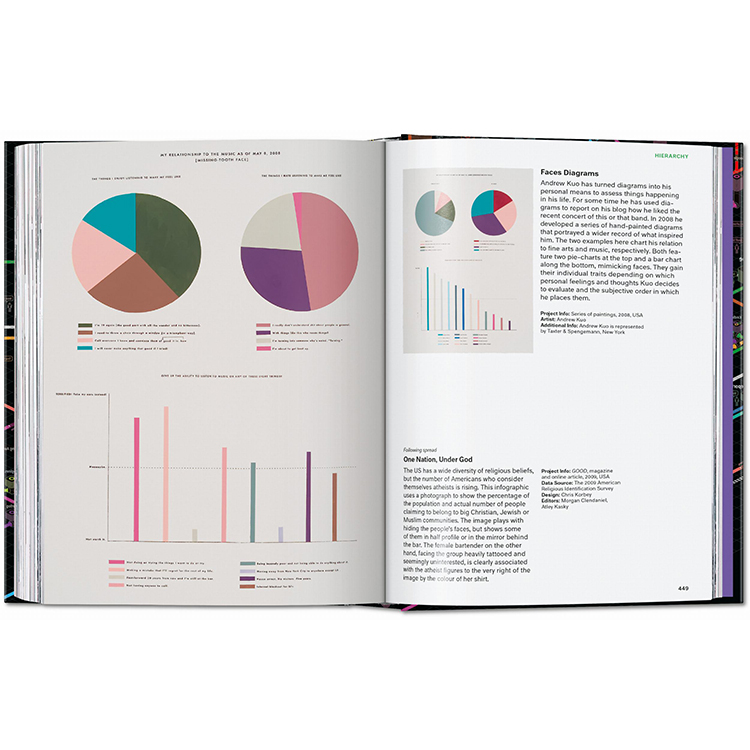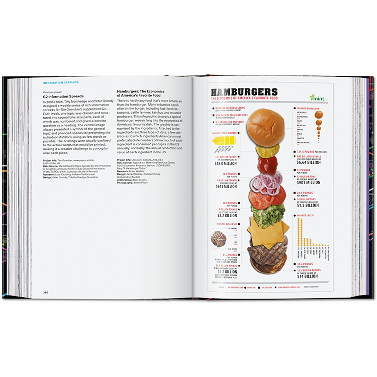저널리즘부터 예술, 정부, 교육 분야까지 아우르는 400점 이상의 대표 인포그래픽 사례가 수록되어 있으며, 각 프로젝트에 대한 설명과 함께 인포그래픽이라는 시각 예술의 진화 과정을 다룬 에세이도 함께 실려 있습니다.