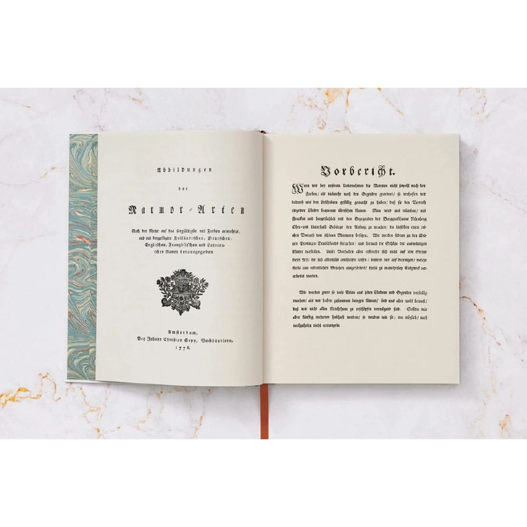 대리석의 철저한 요약본인 아프벨딩 데 마르모 수르텐(Marmor Sorten, 대리석 유형의 표현)은 100개의 컬러 플레이트에 걸쳐 570개의 샘플을 묘사했으며, 5개 언어로 된 텍스트가 첨부되었습니다. 계몽주의가 절정에 달했던 1776년에 출판된 이 책은, 그 시대의 가장 훌륭한 삽화가 들어간 과학 책 중 하나로 당연히 여겨집니다.