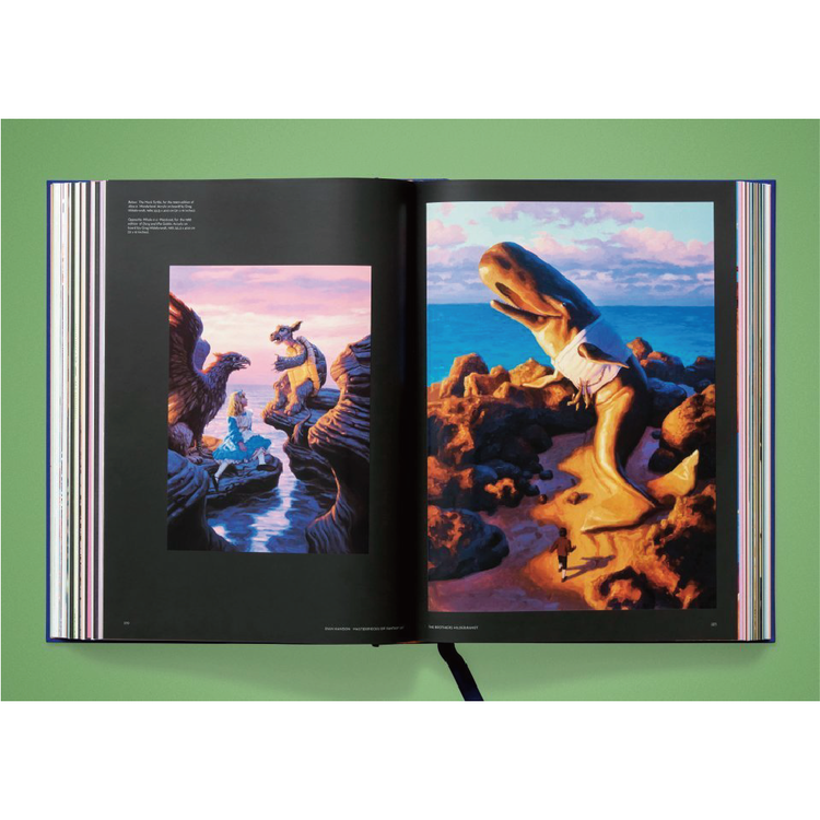 Julie Bell, Philippe Druillet, Frank Frazetta, H.R. Giger, The Brothers Hildebrandt, Jeffrey Catherine Jones, Rodney Matthews, Moebius, Rowena Morrill, Sanjulian, Boris Vallejo, Michael Whelan 등 99명이 등장합니다. Masterpieces of Fantasy Art에 수록된 그림은 역동적이고 공상적인 장르에 몰입할 수 있도록 돕는 스케치, 조각, 달력, 잡지 및 페이퍼백 등 독창적인 그림들을 아카이빙 한 것을 특징으로 합니다.