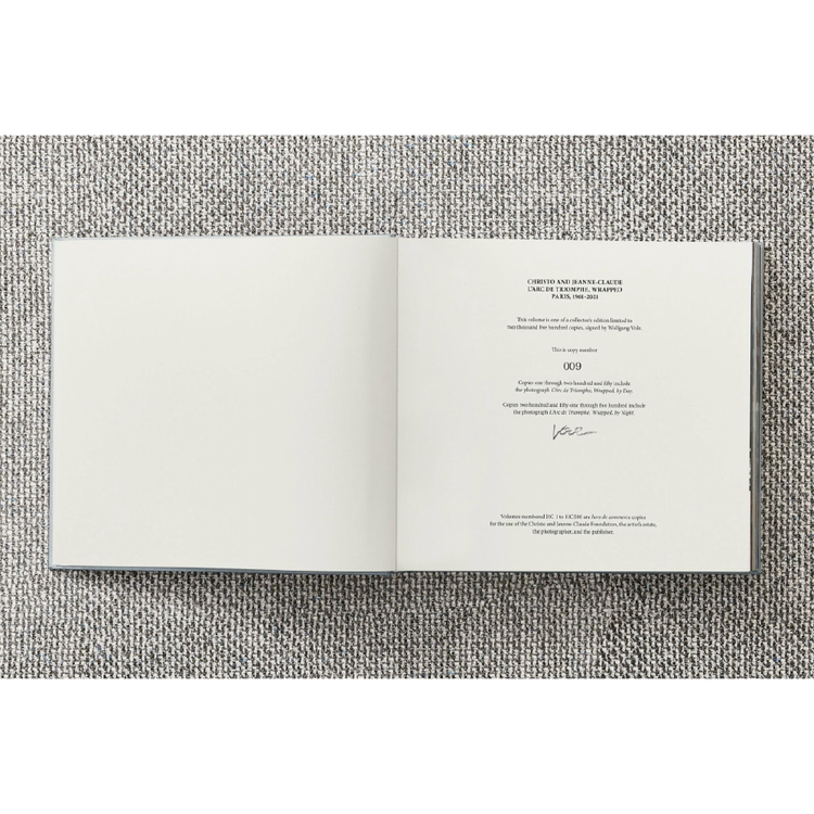 Limited Art Edition (No. 251-500) with the print L’Arc de Triomphe, Wrapped, by Night, 2021, numbered and signed by project photographer Wolfgang Volz.