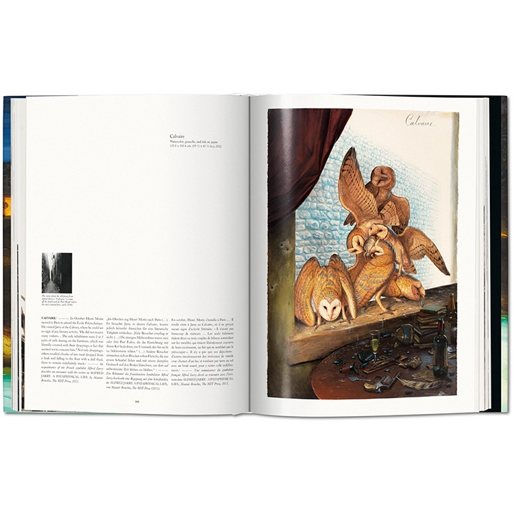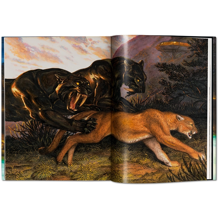 이 놀랍지만 불길한 시각 세계에서, 짐승과 새는 단순한 미적 대상이 아니라 우화적인 투쟁의 역동적인 행위자들이다: 야생 칠면조 한 마리가 발톱에 작은 앵무새를 짓누르고, 원숭이 떼가 공식적인 저녁 식탁을 엉망으로 만들고, 미국 버팔로는 피투성이인 흰 늑대들에게 둘러싸여 있다. 눈부신 수채화 속에서, 그 이미지들은 그들의 복잡한 서사만큼이나 흠잡을 데 없는 사실성에 깊은 인상을 준다.