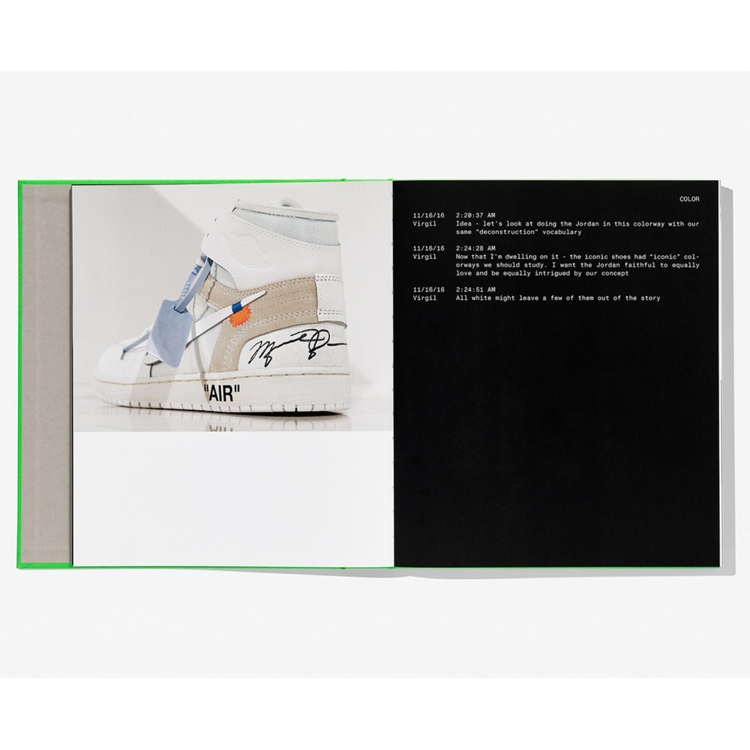 ICONS는 프로토타입에 대한 문서, Abloh가 나이키 디자이너에게 보낸 원본 문자 메시지, 나이키 아카이브의 보물들을 통해 Abloh의 조사적이고 창의적인 과정을 추적합니다. 우리는 에어 조단으로부터 잘라낸 스워쉬를 테이프나 실로 다시 도포한 것, 에어포스 1의 따옴표에 있는 아블로의 전형적인 텍스트 조각, 그리고 조각으로 잘라진 올스타즈를 발견합니다. 뒷모습을 살펴보고 각 모델을 오프화이트로 만든 Abloh의 DIY 접근 방식을 살펴봅니다.TM c/o 나이키는 자신만의 독특한 터치를 수집합니다. 그의 해체적인 어휘는 열린 척추를 보여주고 책의 제작을 폭로하는 스위스 장정에 반영되어 있습니다.