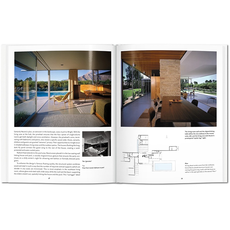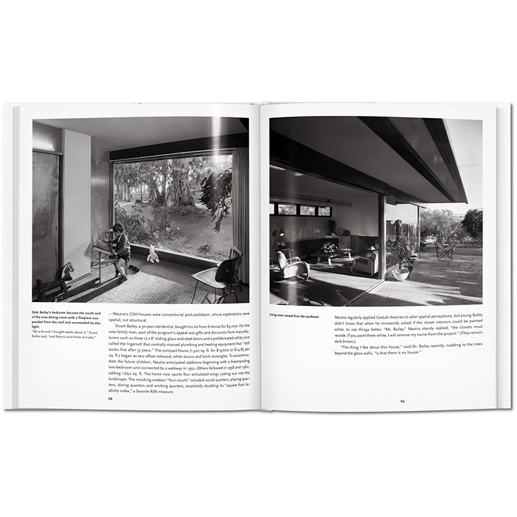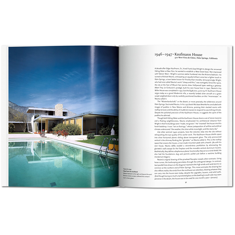 리처드 뉴트라의 건축(1892-1970)에서 내부와 외부의 완벽한 모더니즘적 조화를 발견한다. 캘리포니아의 태양이 매끈한 건물 표면에 반짝이며, 거대한 유리 패널 벽은 산, 정원, 야자수, 그리고 수영장을 파노라마로 조망할 수 있게 한다.
