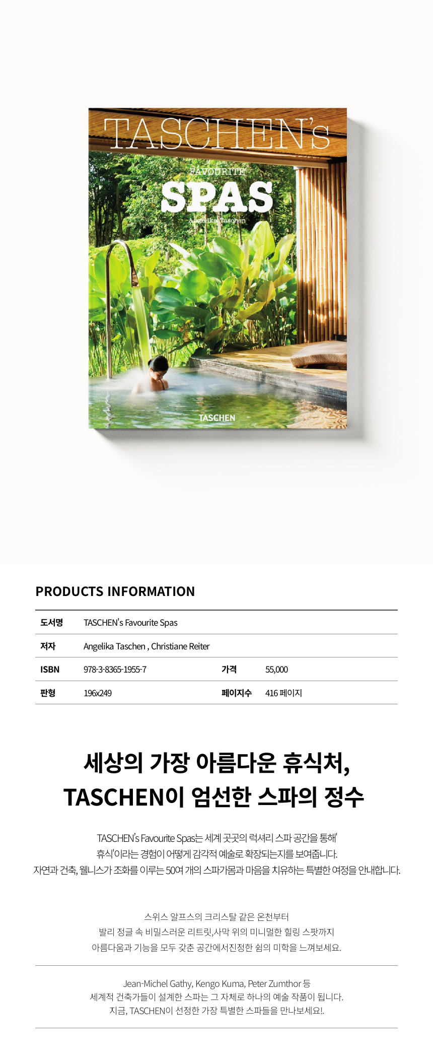 긴장을 풀어주고 얼굴을 생기 있게 하는 마사지를 받거나 치료회복을 돕는 온천수에 몸을 담그는 것은 어떨까? 맛있고 건강한 요리와 밤에 편히 쉴 수 있는 사랑스럽고 편안한 방이 있다면? 음.....우리는 그런 생각들을 한다. 문제는 어떤 스파로 갈 것인가? 하는 것이다. Angelika Taschen가 쓴 TASCHEN의 Favorite Spas는 당신의 가장 완벽한 스파 휴가를 위해 당신을 선택의 고민에서 구하고 세계적으로 가장 매혹적인 휴양지들을 소개한다. 그녀의 여행은 에스토니아 서해 연안에 있는 무후(Muhu)섬의 역사적인 리조트 Pädaste Manor처럼 천국 같은 휴식처로 우리를 안내한다