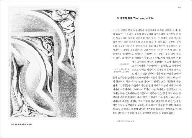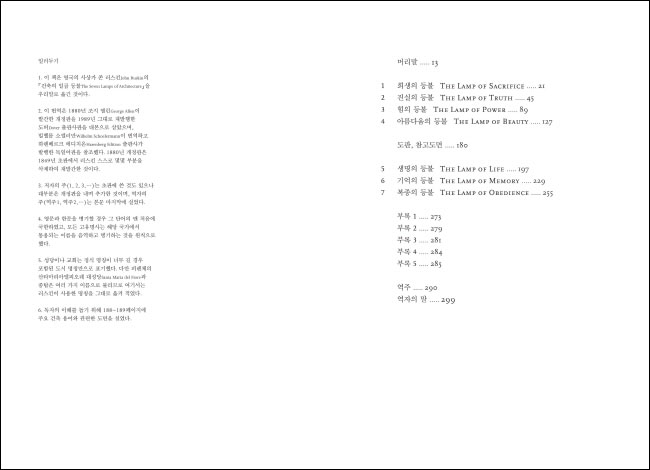 러스킨은 여러 예술 분야 가운데서도 건축이야말로 예술의 시작이자 그 시대와 질서의 본보기라고 믿었다. 건축은 건축가 개인이 아닌 정치공동체의 여러 이해관계와 그 이해를 판단하고 결정하는 공동체의 시대적 정신성에 따라 완성되는 것이기 때문이다. 그래서 이 글은 올바른 건축을 하기 위한 정신(등불)을 사회를 이끌어가는 정신으로 상정하고, 그것을 ‘희생, 진실, 힘, 아름다움, 생명, 기억, 복종’이라는 일곱 가지로 정리한 것이다.