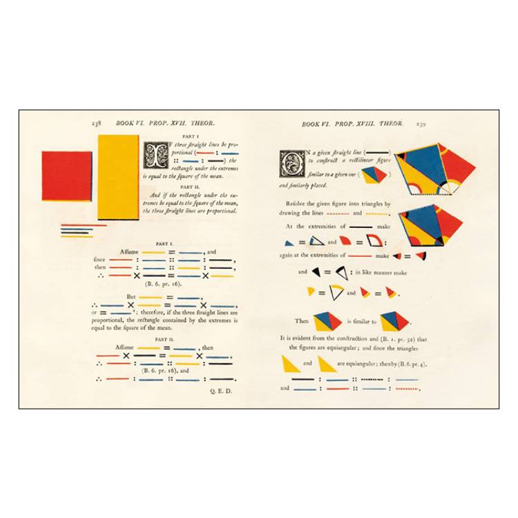 빨강, 노랑, 파랑, 그리고 검정. 1847년 올리버 번(Oliver Byrne, c.1810–c.1880)이 발간한 유클리드 기하학의 수식과 도형에 사용한 색깔들이다. 치즈윅 프레스(Chiswick Press)가 인쇄를 맡고, 윌리엄 피커링(William Pickering) 사에서 출판한 이 진귀한 유클리드 서적은 출간되자마자 독자들로 하여금 즉각적으로 몬드리안을 떠올리게 했다.