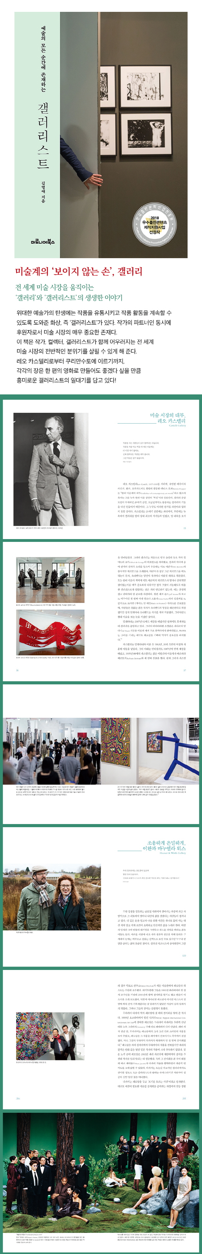 카스텔리 갤러리의 레오 카스텔리, 가고시안 갤러리의 래리 가고시안, 페이스 갤러리의 아르네 글림처, 데이비드 즈위너 갤러리의 데이비드 즈위너 등 유럽과 미국에서 현대 미술 시장의 성공을 주도한 업계 최고의 갤러리스트(1부)를 비롯해 존슨 창과 로렌츠 헬블링, 호세 쿠리와 모니카 만수토 등 아시아 및 남미를 중심으로 새로운 길을 개척하고 있는 갤러리스트(2부)도 만나볼 수 있다. 이 책을 통해 작가, 컬렉터, 갤러리스트가 함께 어우러지는 전 세계 미술 시장의 전반적인 분위기를 살필 수 있을 것이다.