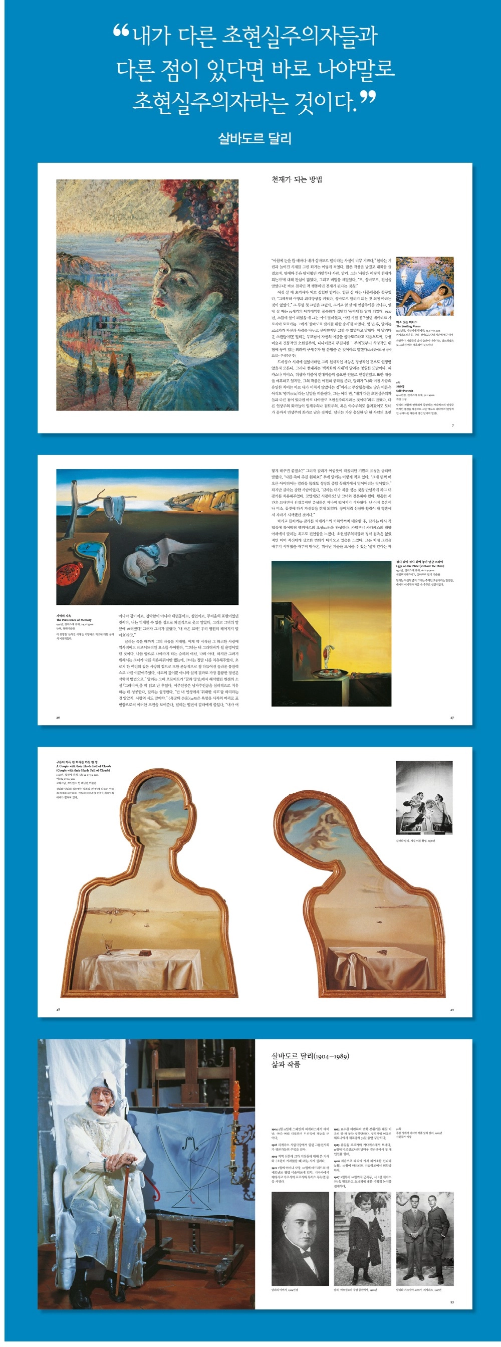 “아침에 눈을 뜰 때마다 내가 살바도르 달리라는 사실이 너무 기쁘다.” 불타는 기린과 늘어진 시계를 그린 화가는 이렇게 적었다. 많은 작품을 남겼고 대화를 즐겼으며, 명예와 돈을 탐닉했던 카탈루냐 사람, 달리. 그는 ‘사람은 어떻게 천재가 되는가’에 대해 관심이 많았다. 그리고 비법을 깨달았다. “오, 살바도르, 진실을 알았구나! 바로 천재인 척 행동하면 천재가 된다는 것을!”
