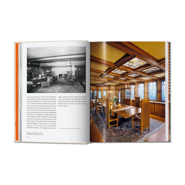 TASCHEN의 이전 모노그래프를 바탕으로 한 이 철저한 편집본은 라이트의 방대한 작품 중 가장 중요한 작품들을 모아 미국의 가장 유명한 건축가에 대한 권위 있는 개요를 제공합니다. 아리조나에 위치한 탈리에신 웨스트에 있는 프랭크 로이드 라이트 재단의 아카이브에 대한 무제한 접근을 바탕으로, 이 컬렉션은 라이트의 초기 프레리 하우스, 유소니안 컨셉트 하우스, 상징적인 폴링워터부터 도쿄 시절의 작업, 행정 건물 및 예배 장소 디자인, 그리고 뉴욕의 구겐하임 미술관과 같은 후속 고프로젝트들, 나아가 "살아있는 도시"라는 더 나은 내일을 위한 그의 환상적인 비전까지 폭넓게 다룹니다.