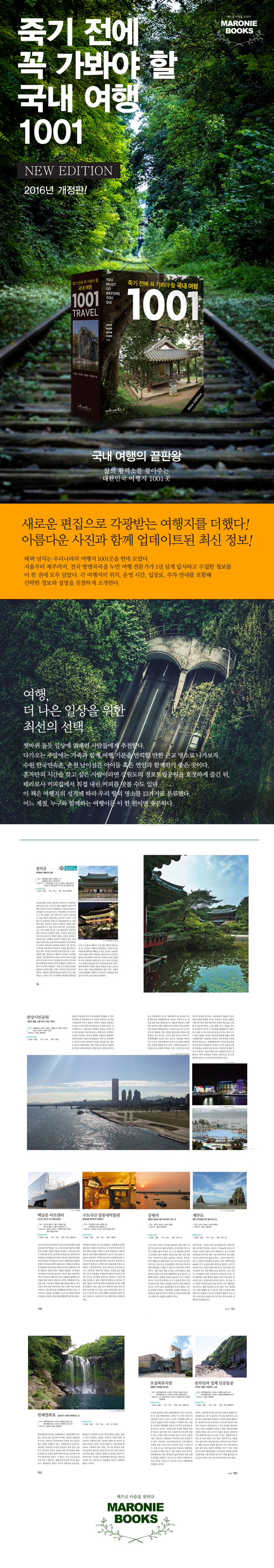 국내의 매력적인 여행지 1001곳을 소개하는 이 책은 서울부터 제주까지 구석구석의 명소를 담았다. 국내 여행 전문 작가들이 1년 동안 발품 팔아 전국 방방곡곡을 누비며 찾아낸 명소들을 친절하게 소개한다. 책에서는 해당 여행지의 위치, 운영 시간, 입장료, 주차 안내 등의 간단한 정보와 세심하고 친절한 설명을 제공하고 있으며 해당 여행지의 사진을 통해서 생생함을 담아냈다.