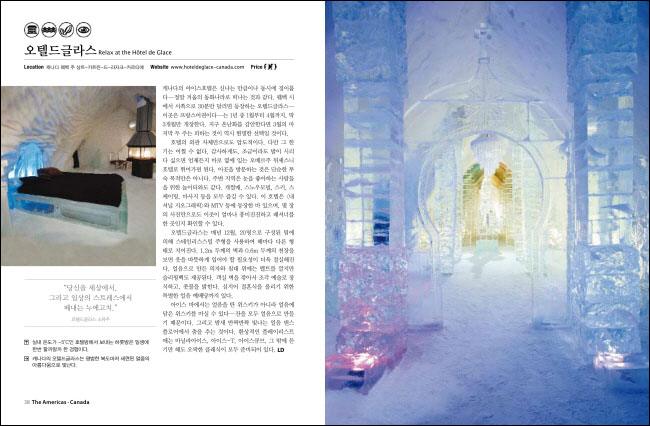 세계에는 릴랙스할 수 있는 곳들이 정말로 많다. 예를 들면 환상적으로 외진 등대에서 인파로부터 벗어나 나만의 굴을 팔 수 있다. 쿼폰 섬에 있는 쿼폰라이트하우스 인에 가 보자. 뉴펀들랜드 북쪽에 있는 조그만 섬으로, 사랑스럽게 복원된 2개의 등대지기 숙소 외에는 말 그대로 아무것도 없다. 또 이 책에는 입이 벌어지는 호텔들도 포함되어 있다. 잉글랜드 전원 깊숙이 자리잡은 르 마누아나 홍콩의 상징이 되어버린 페닌슐라처럼 미슐랭 스타 레스토랑을 자랑하는 월드 클래스 호텔부터, 과거 어부의 오두막을 개조한 덴마크의 가정적인 쇤 데르호 크로에 이르기까지 말이다. 또 벌어진 입이 다물어지지 않는 스웨덴의 아이스 호텔이나 인도 케랄라 트랜퀼 리조트의 리 하우스처럼 특이한 숙박 시설도 빼놓지 않았다. 안락함과 럭셔리에서 정도의 차이는 있겠지만, 그 어디라도 모두 아름답고, 여유로우며, 한번 발을 들여 놓으면 떠나고 싶지 않은 곳들이다.