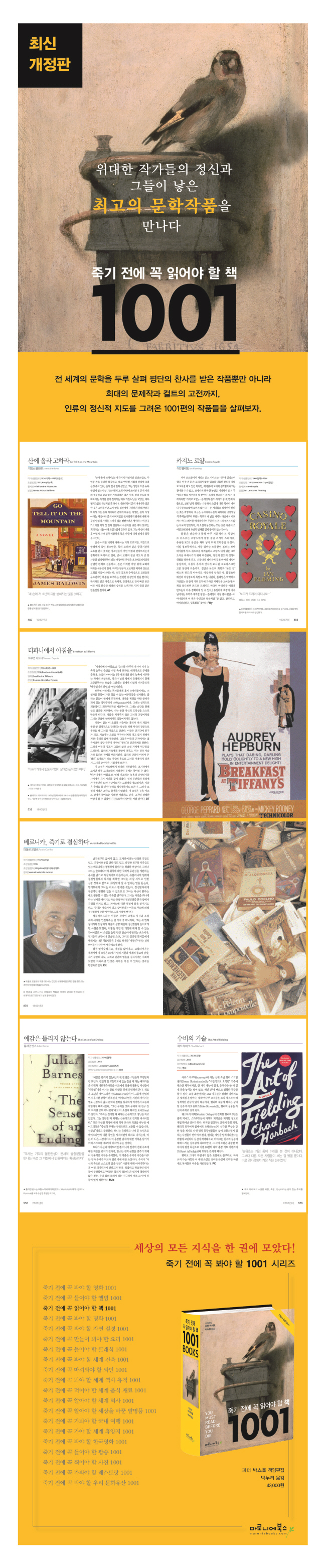 『죽기 전에 봐야 할 영화 1001편』, 『죽기 전에 들어야 할 앨범 1001장』에 이은 대표적인 1001 시리즈. 책에서 소개하는 1001권의 ‘책’은 다양한 분야의 책 중에서도 소설 문학의 작품들을 지칭한다. 전 세계의 문학을 두루 살펴 평단의 찬사를 받은 작품뿐만 아니라 희대의 문제작과 컬트의 고전까지, 인류의 정신적 지도를 그려온 1001편의 작품들을 망라하였다.