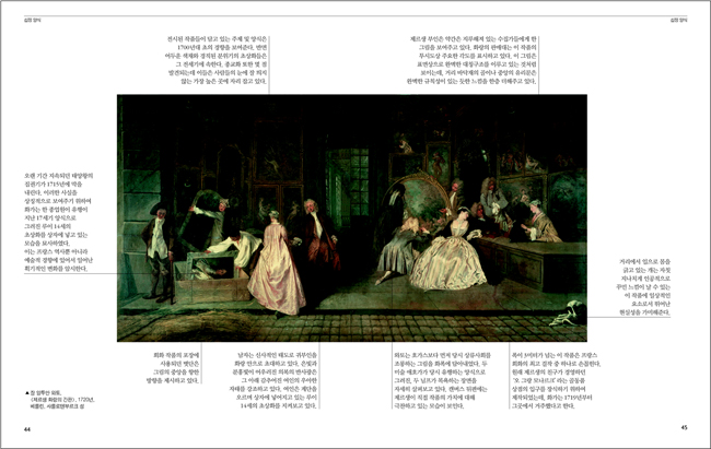 이와 비교했을 때 18세기 미술에 대한 인지도는 상대적으로 낮은 편이다. 하지만 18세기는 서양 미술의 근간을 이루어온 일련의 미술 흐름에서 볼 때 다양한 모습으로 사회 각 분야에 활용되기 시작한 중요한 시기다. 바로크로부터 이어져 화려한 궁정 미술로 꽃피운 로코코 미술, 궁정을 아름답게 수놓았던 각종 공예품, 베네치아와 각종 아름다운 풍경을 화폭에 담은 베두토 회화 등 다양한 그림들을 통해 18세기 미술은 당대 특유의 예술적 업적을 이룰 수 있었다. 18세기 화가들은 뚜렷한 형태감과 선명한 색조를 통해 그려지는 대상, 즉 모델들의 모습을 매우 장식적으로 묘사했다. 이러한 화려한 색감이 이후에 등장하는 낭만주의와 인상주의 미술에 큰 영향을 미치게 된다.