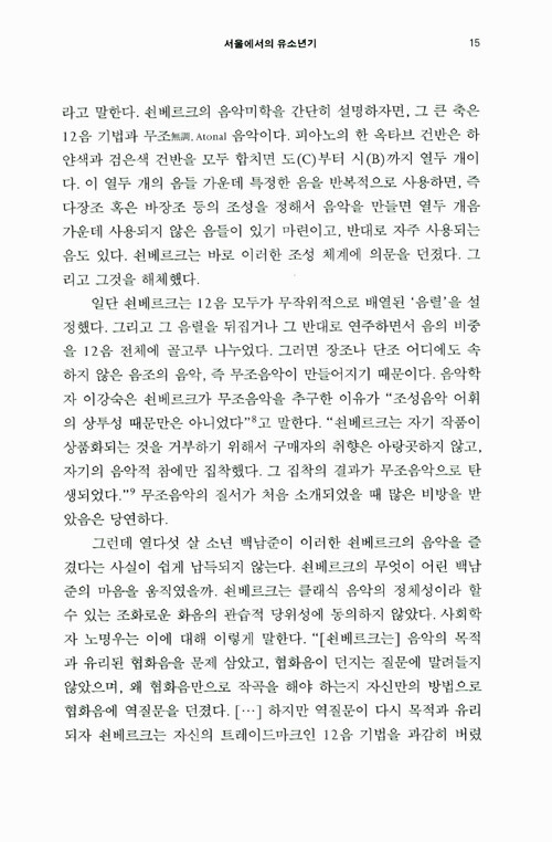 “청년 백남준은 가슴에 쇤베르크를 품었고 손은 과격했다. 테이프레코더와 텔레비전은 보이지 않는 세상을 향해 달리는 백남준의 발이 되어 주었다. 훗날 ‘비디오아트의 선사’로서의 백남준의 삶의 근원에는 청년기를 관류했던 아방가르드 정신이 자리한다. (…) 이 책은 7년여 동안(1956년부터 1963년까지) 독일에 살면서 새로운 예술 인생을 펼친 청년 백남준을 만나러 간다.” – 프롤로그에서
