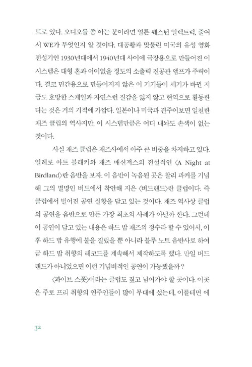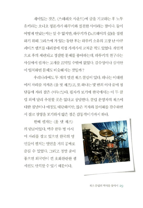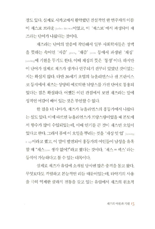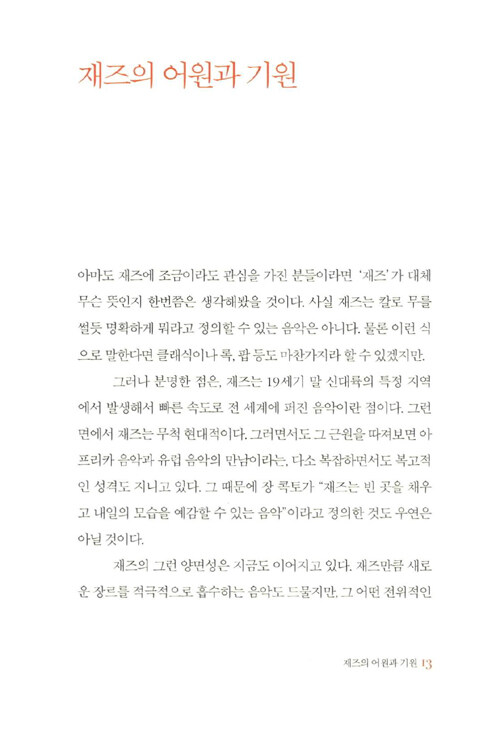 필자가 이 책을 쓰면서 겨냥한 것은 되도록 이런 연주인들의 기분을, 또 재즈의 맛을 다채롭게 전달하고자 함이다. 아무 데나 들어가서 커피 한 잔 시켜놓고 가져온 책을 읽거나 물끄러미 창밖을 바라보면 시간도 참 천천히 흐르고, 머리도 맑아지곤 했다. 이런 한가한 시간의 동반자로 본서가 쓰였으면 하는 바람이다.