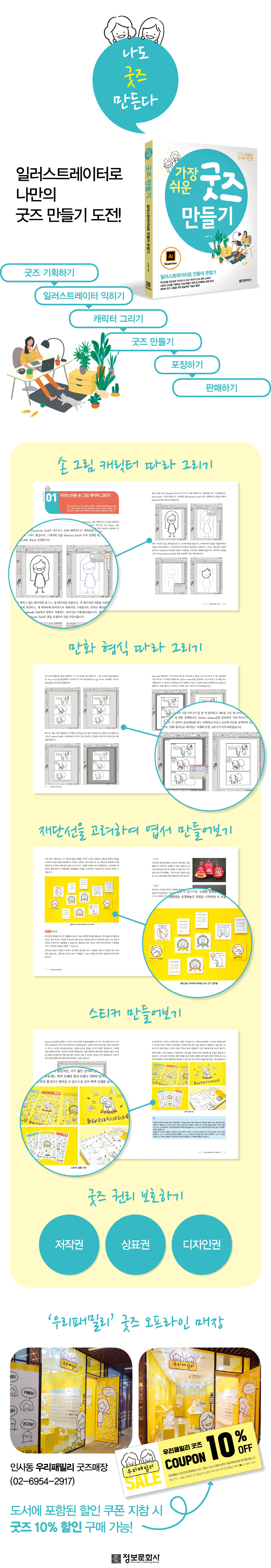 굿즈를 제작하고 싶지만 무턱대고 바로 디자인을 시작할 수는 없다. 나만의 매력적인 굿즈를 만들기 위해 처음 접하는 기획부터 캐릭터의 콘셉트와 스토리로 시작되는 이 책에서는 최종 목적인 굿즈 판매까지 알려주므로 수익 창출을 위한 최고의 방법을 소개한다. 캐릭터를 그리기 위해 일러스트레이터 프로그램을 사용하는데, 초보자도 쉽게 따라 할 수 있도록 친절하게 설명하고 있다. 특히 문구류, 생활용품류, 봉제류 등 다양한 굿즈의 예시를 보여줌으로써 본인이 원하는 방향을 선택할 수 있는 폭을 넓혔다. 그리고 굿즈를 판매하기 전에 포장하는 방법과 판매를 위해 고려해야 할 다양한 문제들을 실제 경험담으로 풀어내기 때문에 굿즈 사업을 시작하는 이들에게 최고의 안내서가 될 것이다.