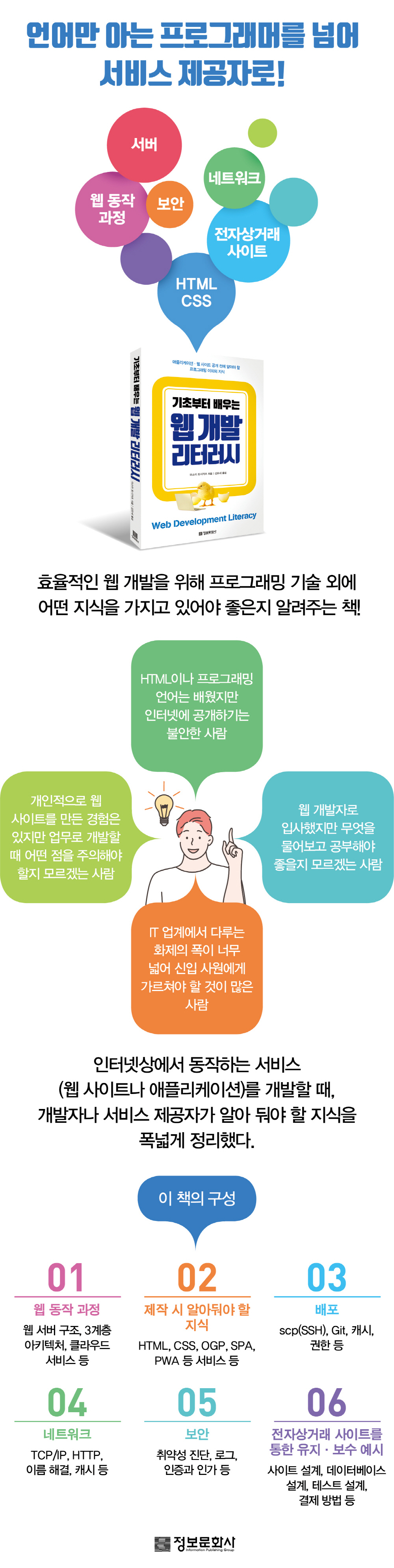 이 책은 효과적인 학습을 위해 웹 사이트를 제작하고 공개하는 순서로 진행된다. 웹의 동작 과정부터 HTML, CSS 등의 제작 지식과 웹 기술 트렌드를 설명한다. 그리고 웹 사이트 배포를 위한 서버와 네트워크 지식, 보안을 다룬다. 추가로 요즘 활발히 사용되는 전자상거래 사이트에 대한 장을 따로 분리해 설계와 운용을 담았다. 직접 웹 사이트를 개발해 보고 싶은 사람, 업무로 웹 사이트를 개발할 때 어떤 점을 주의해야 할지 모르겠는 사람, 웹 개발자로 입사했지만 무엇을 물어보고 공부해야 할지 헷갈리는 사람들을 위한 책이다.
