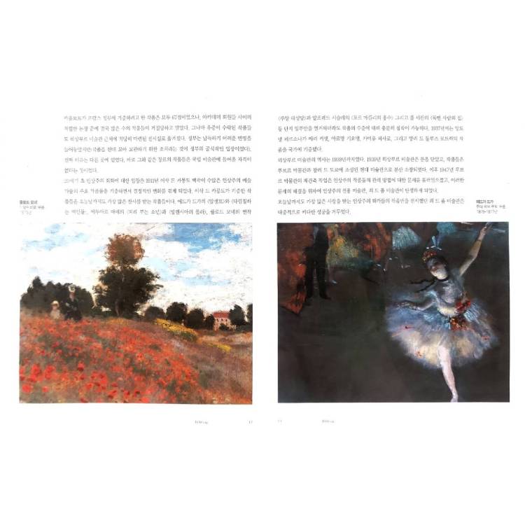 클로드 모네와 오귀스트 르누아르의 진동하는 색채, 드가가 그린 발레리나, 카유보트의 선명한 필치, 앙리 드 툴루즈 로트렉의 파스텔화가 시선을 사로잡는다.