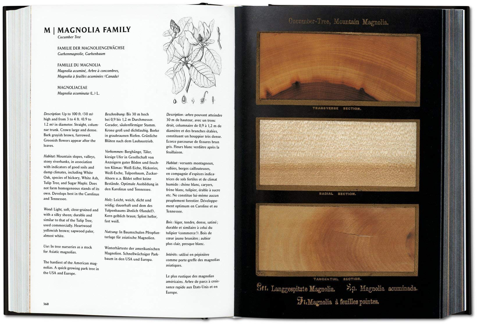 Taschen에서 발간하는 우드 북(Wood Book)은 원본에 남아 있는 견본을 모두 섬세하게 복제하여 제작한 것으로쎠, 복제를 위해 나무 컷에 미치는 손상이 최소화되어 있는 훌륭한 상태로 남아 있는 지극히 희귀한 원본을 사용하였다. 현재 알파벳 순서에 따라 배열되어 있는 모든 나무는 방사형과 수평, 수직의 3개 횡단 절단면을 보여주게 되어 있으며, 이는 수많은 나무들의 풍부한 색과 질감, 씨앗의 특징 등을 보여줄 수 있도록 되어 있다. 또한 본 특별판에는 대부분의 나뭇잎과 과실을 찰스 스프라그 사르겐트(Charles Sprague Sargent)가 제작한 석판화와 나무의 원산지와 물리적 특징 등에 관한 설명이 포함되어 있다.
