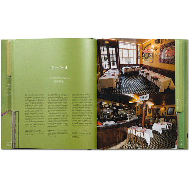 본서는 안젤리카 TASCHEN의 파리 호텔, 상점, 식당, 카페, 바 등을 한 권의 책으로 소개하여 방문자들이 파리 체류 중에 결코 시간을 낭비하지 않도록 해준다. 가장 최신의 콜레트 패션 개념 상점에서 톰 포드의 비밀의 하이드웨이까지 모든 최고의 팁을 통해 많은 흥미로운 시간을 보낼 수 있도록 해준다.