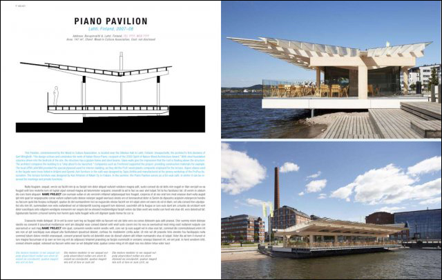 목재는 현대 건축을 위한 가장 훌륭한 재료이며, 이 책은 독자들이 책을 통한 짧은 시간 내에 흥미롭고 역동적인 전 세계의 목재 건축의 새로운 사용법을 알려준다. 이스턴의 건축과 같이 나무의 쓰임은 고대 건물에서도 볼 수 있다. 그리스 신전 기둥은 나무의 모양으로 디자인되었다. 오늘날 목재 건물들은 자연 그대로 우리에게 다가오며 어떤 것으로도 변할 수 있는 이 시대 최고의 재료이다.