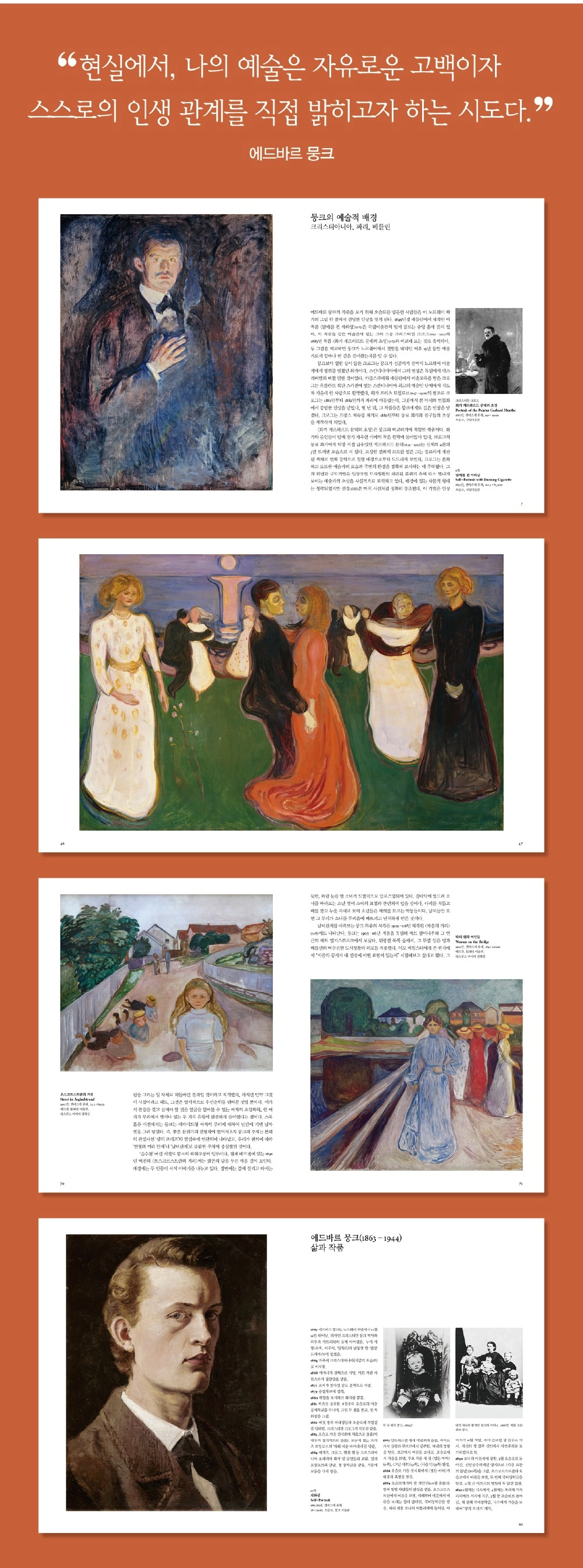이 책은 뭉크의 사이코드라마(심리극)에 대한 뛰어난 능력을 소개한다. 풍부한 삽화를 통해 관계와 감정에 대한 작가의 반응을 보여주는, 강렬한 색감과 더불어 어두우며 심오하게 현대적인 형상을 함께 살펴본다. 작가 본인이 ‘자유로운 고백’의 수단으로 여긴 이러한 설득력을 가진 이미지들은 오늘날 모더니즘의 벼랑 끝에 마치 자석처럼 붙은 채로 남아 있다.