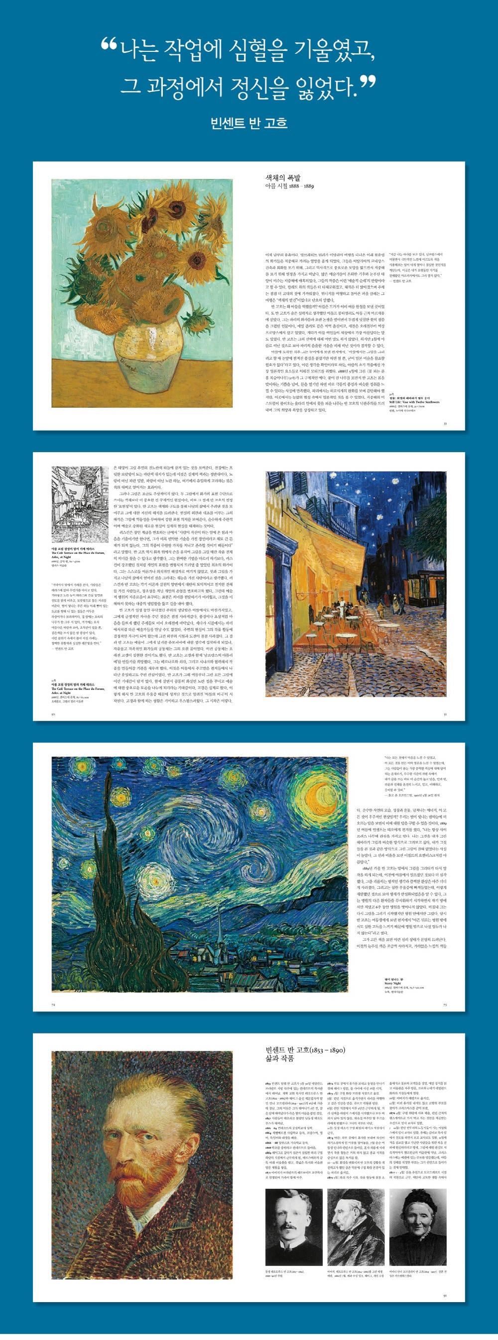 20세기 회화의 위대한 선구자 빈센트 반 고흐(1904-1989)(1853-1890)의 작품들은 오늘날 세계에서 가장 유명하고 잘 알려진 작품들이다. 페인트, 연필, 숯 또는 분필 등으로 그린 <해바라기>, <별이 빛나는 밤>, <귀에 붕대를 감은 자화상>, 그리고 많은 다른 작품들을 통해 감정과 장소 묘사에 특히 뛰어났던 예술가라는 사실을 알고 있다. 그러나 반 고흐는 후세에 짙은 색채, 힘찬 붓놀림, 윤곽의 형태, 배치 등으로 표현주의 화가들에게 영감을 주며 이름을 널리 알린 것과 달리, 당시에는 관객들의 관심을 받지 못했을 뿐만 아니라 정신 질환과도 고통스럽게 마주하고 있었다. 그를 짓누르던 우울증과 불안 장애는 결국 1890년, 서른일곱 번째 생일이 지나고 스스로 목숨을 끊게 만들었다. 이 풍부한 삽화들은 빈센트 반 고흐의 초기 농촌 노동자들의 그림을 시작으로 파리 시대를 거쳐, 그의 생애 마지막 2년 반 동안 프랑스 남부에서 폭발한 창조적 에너지에 이르기까지, 그의 이야기를 아우르고 있다.