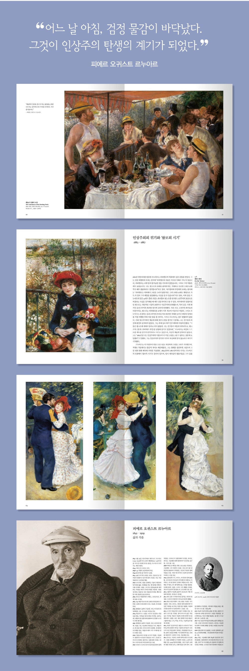 인상주의 운동의 선두주자 중 하나였던 피에르 오귀스트 르누아르(1841-1919)는 여전히 대중적 지지를 받는 미술사의 거장으로 남아있다. 따스하고, 매력적이고, 관능적인 그의 작품은 시대의 풍경화와 색채 혁신의 거장으로서의 모습과 동시에 가볍고 밝은 그림들을 보여준다.